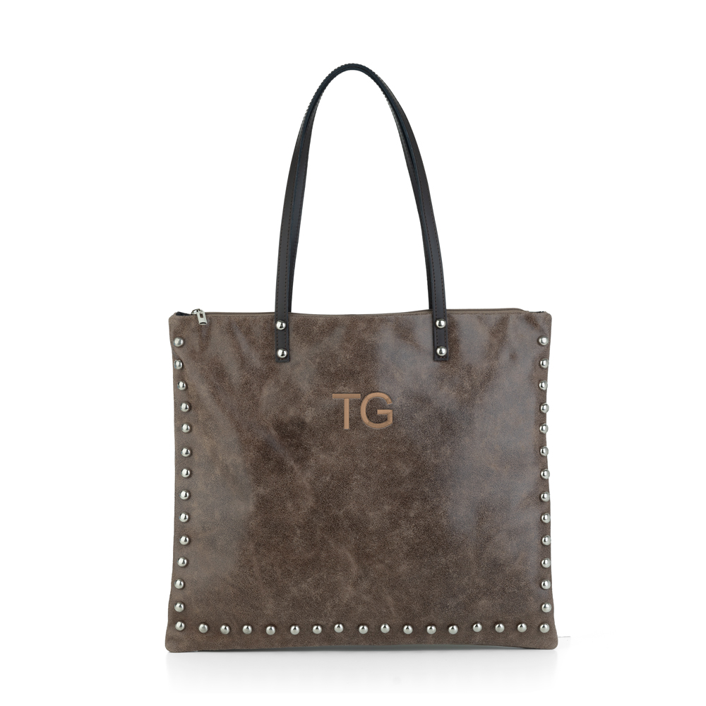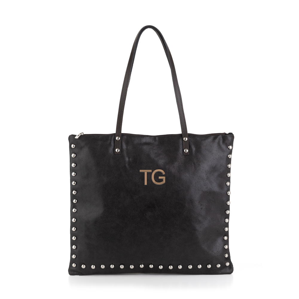 – Bolso color Marrón, bordado con Iniciales, tipografía Sencilla, de tamaño 2,5 cm (alto aproximado), en color Beige oscuro. TG