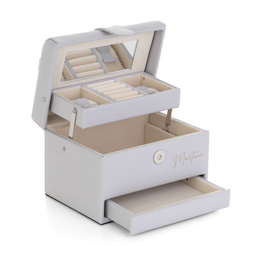 - Joyero gris personalizado con Nombre, tipografía Firma, en color dorado mate. Martina